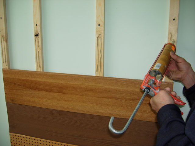 - Only after that it is possible to glue the laminate on a flat surface with a special tool, each element of the finish is checked according to the level. Installation can be done both horizontally and vertically.