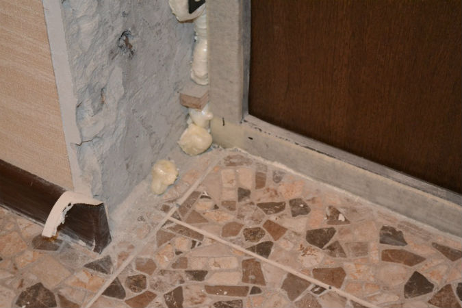 Si los espacios entre la pared y el nuevo material de acabado son muy grandes, debe usar espuma de montaje. La espuma de poliestireno o el poliestireno expandido se adhiere a la puerta con pegamento especial.