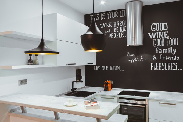 La pizarra familiar para todos desde la infancia se utiliza cada vez más en edificios residenciales y apartamentos, y no solo en habitaciones infantiles. El revestimiento mate negro o de color se convierte no solo en un lugar para dibujos y notas, sino también en un elemento de decoración. Y es posible crearlo con una pintura de pizarra especial: con sus propias manos, se aplica fácilmente a cualquier superficie.