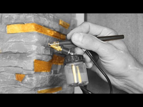- Aerógrafo. Su ventaja es la pulverización y no la difusión de la composición colorante, lo que permite obtener un color natural y liso. Al ajustar la distancia desde el aerógrafo a la superficie del panel de yeso y el chorro de tinta, puede dar a los tonos de piedra de yeso del mismo color, claro o más oscuro.