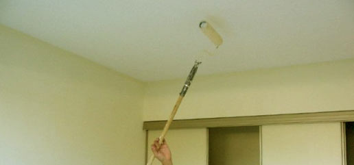 Consejo: El techo de paneles de yeso debe pintarse con un rodillo solo con una pila corta, esto le permitirá obtener un revestimiento liso y de alta calidad al final del trabajo. No use un rodillo de espuma para pintar el techo, ya que deja marcas. El rodillo para el techo debe tomarse con un mango largo, como se muestra en la foto.