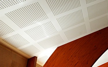 - Acústico. Se usa muy raramente. La peculiaridad del material es la presencia de perforaciones con muchos agujeros, cuyo diámetro es de aproximadamente un centímetro y una lámina insonorizada especial ubicada en la parte posterior de la lámina. Se utiliza en el diseño de estudios de grabación, cine en casa.