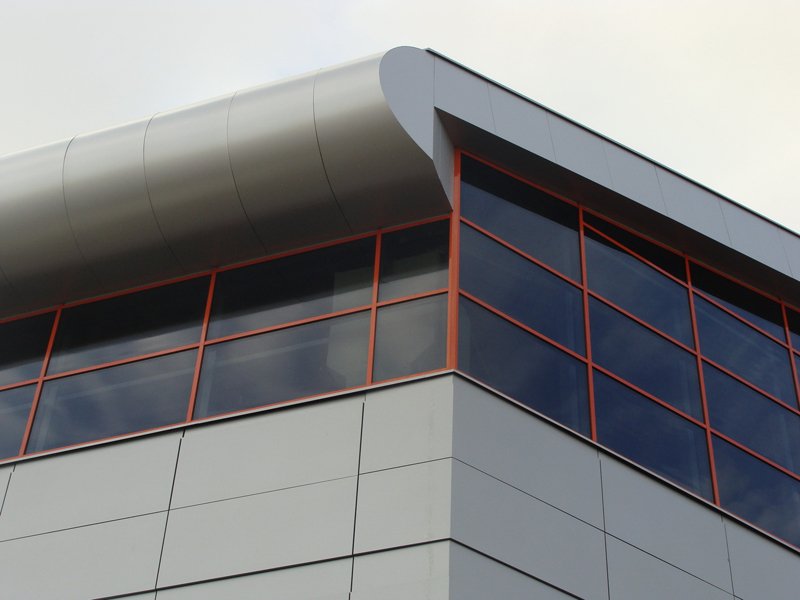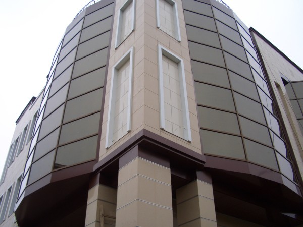 Una oficina o edificio de oficinas con revestimiento de paneles compuestos de aluminio siempre se ve sólido y respetable. También es muy estéticamente agradable, especialmente si su configuración contiene elementos arquitectónicos semicirculares en forma de cornisas, parapetos, columnas.