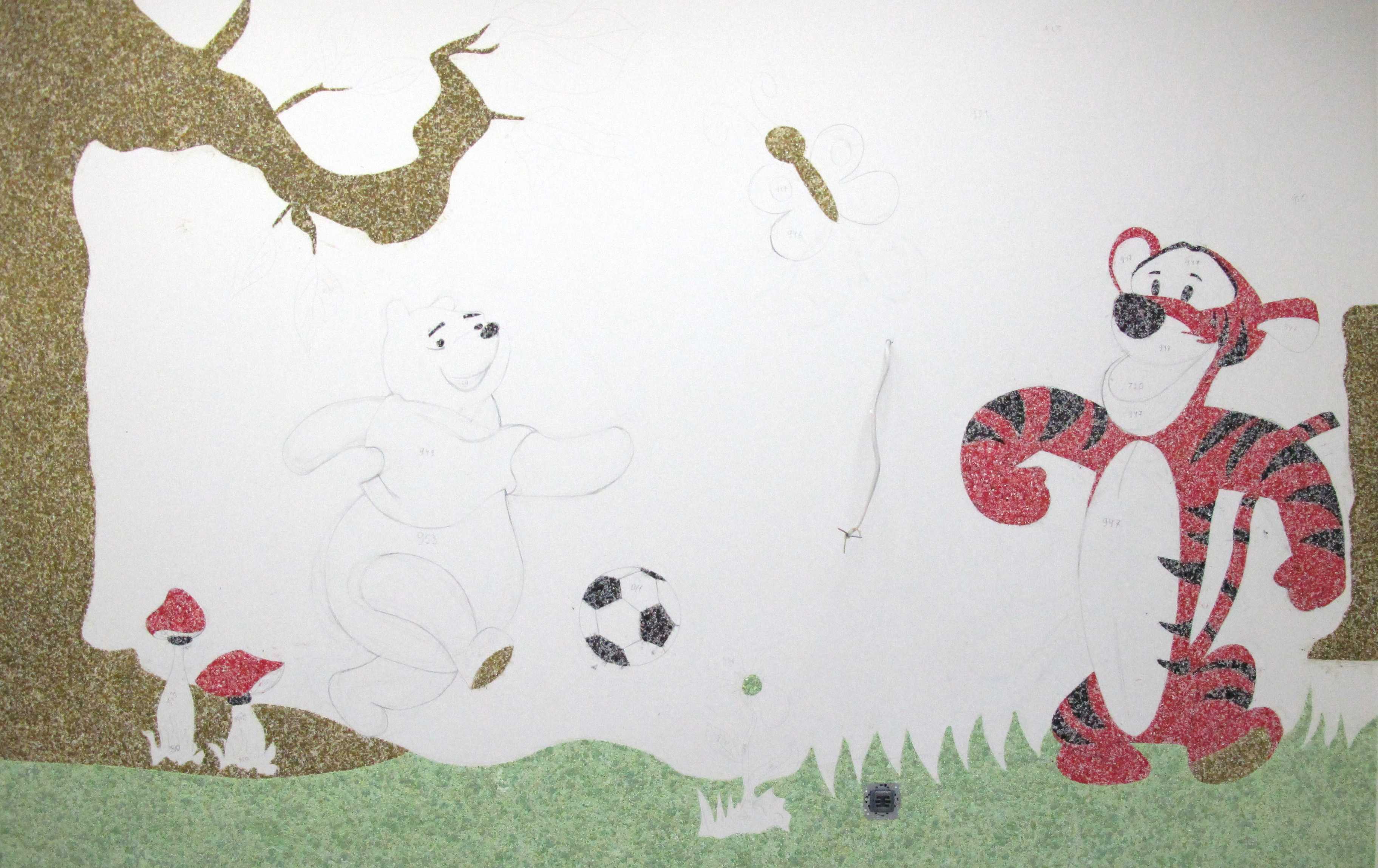 - Con un lápiz o marcador, el contorno del dibujo futuro se aplica a la pared, y cada sección se marca con el color que deberá cerrarse.