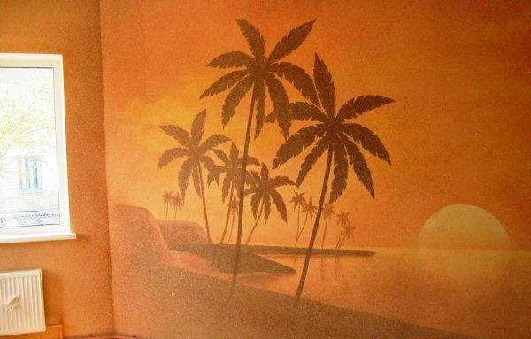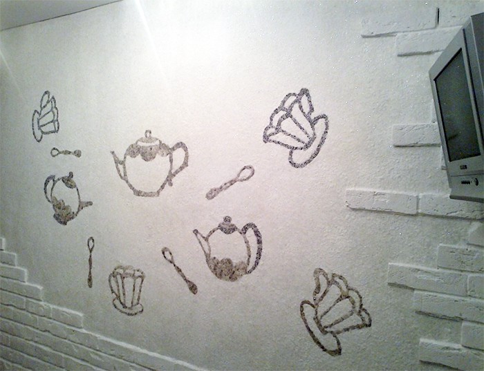 Este método se considera el fondo de pantalla líquido y el dibujo más simple y rápido en dos etapas. Primero, se aplica el revestimiento primario del fondo de pantalla, y después de que se seque, se pega una plantilla en los lugares correctos con cinta adhesiva.