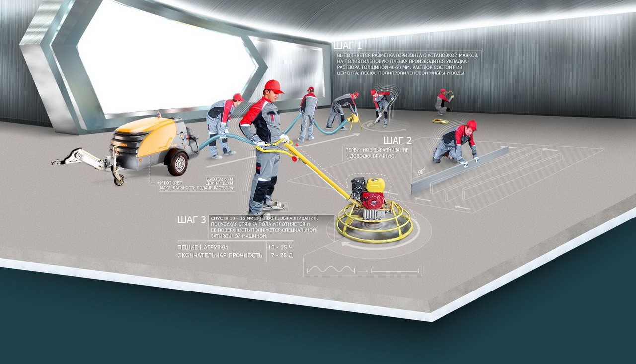 El vertido fino no se realiza por separado, ya sea que desempeña el papel de una regla de acabado aplicada sobre la base rugosa y sobresaliente para organizar el piso, o viceversa, nivelando la base para una mayor instalación de refuerzo y vertido de concreto.