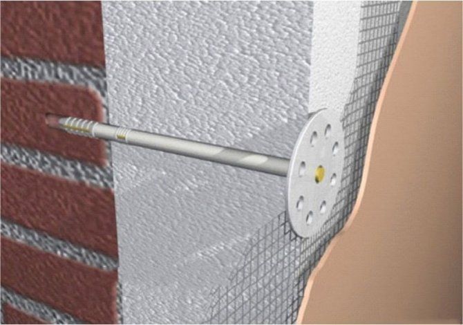 - El aislamiento de la fachada se lleva a cabo de acuerdo con el siguiente esquema: en un sitio de instalación preparado previamente para elementos de montaje, se realiza un receso utilizando un perforador, de la longitud requerida y el diámetro correspondiente (a través de una espuma fija).