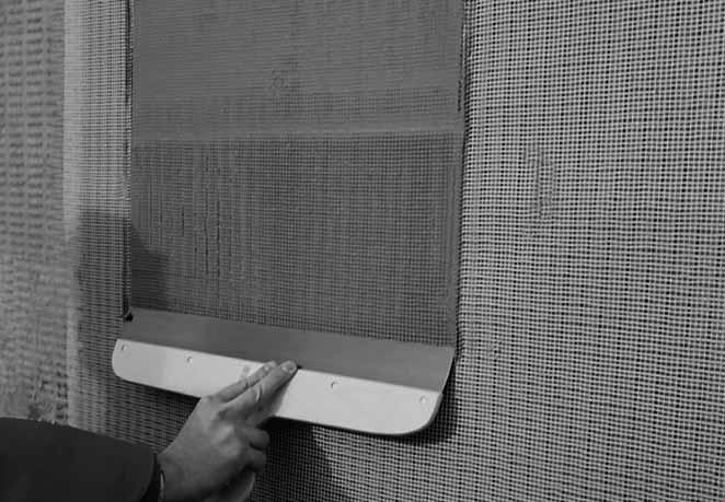 La solución adhesiva se aplica en una capa delgada sobre la superficie de la espuma, y la malla se presiona con una espátula. Es deseable lograr una cobertura total de la malla con solución adhesiva. Si surge la necesidad, entonces la solución se puede aplicar un poco más.