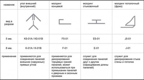 La figura muestra los diversos elementos, las llamadas molduras, que lo ayudarán en el proceso de instalación de los paneles. Las molduras ayudan a ocultar las juntas de los paneles en las esquinas y en las juntas de los paneles a lo largo de la longitud, así como en lugares adyacentes a la ventana y puertas.