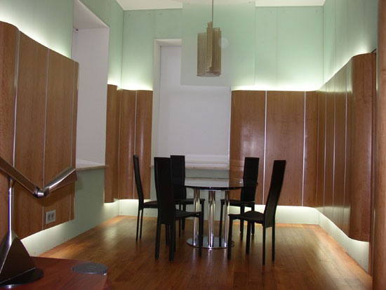 Les murs et le plafond sont garnis de peinture neutre de couleur vert pâle. La décoration principale de ce bureau est une image panoramique sur le mur devant la table, réalisée à l'aide de papier peint photo.