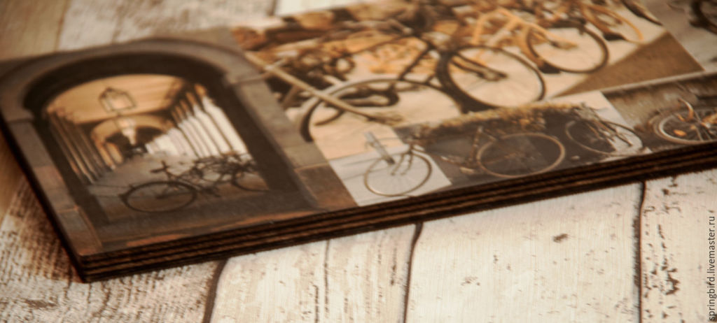 Lorsque tout le papier est enlevé, vous verrez que notre photo est complètement transférée sur l'arbre, et maintenant il est nécessaire de la protéger avec une couche de vernis, et en plus, vous pouvez vieillir un peu. Pour ce faire, prenez un papier de verre nul et, avec des mouvements légers, essuyez-le avec une photo. L'image devient comme sur une vieille photo et elle a l'air très impressionnante.