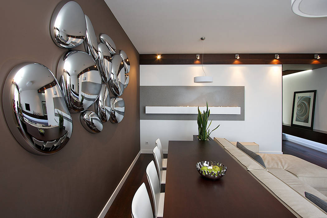Ici, il peut s'agir de peintures ou d'affiches, ainsi que de miroirs d'une forme inhabituelle. Soit dit en passant, les concepteurs recommandent d'utiliser autant de miroirs que possible dans un tel intérieur, comme vous le savez, ils agrandissent visuellement l'espace, et même la plus petite pièce peut sembler tout simplement énorme.