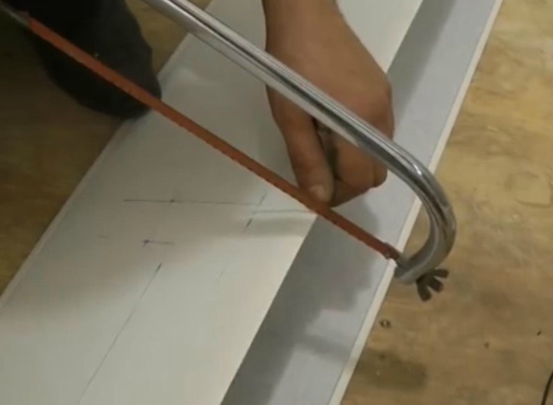 Con una sezione trasversale, è necessario tagliare gli irrigidimenti con un coltello da costruzione nel punto contrassegnato. Quindi, con una sega a denti piccoli, il pannello viene tagliato.