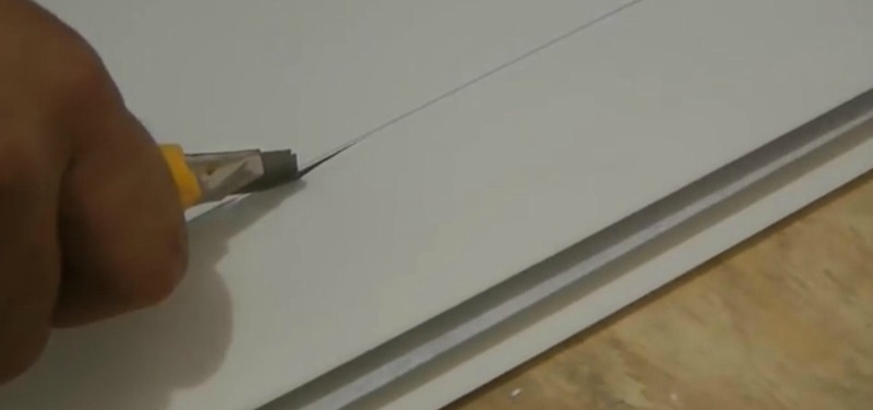 Disegniamo un coltello da costruzione lungo la linea misurata fino a ottenere la larghezza di cui abbiamo bisogno. Come abbiamo già detto, i pannelli in PVC sono ben tagliati.