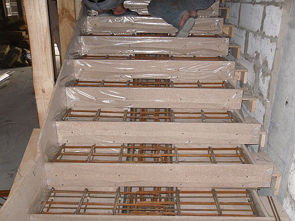 Per ottenere la massima scorrevolezza della superficie dei gradini, non vengono posizionati pannelli speciali su di essi. - Tre ore dopo il versamento, vengono rimossi e la superficie del calcestruzzo viene bagnata con acqua. E per fare questo, al fine di evitare la comparsa di crepe, è necessario farlo regolarmente.