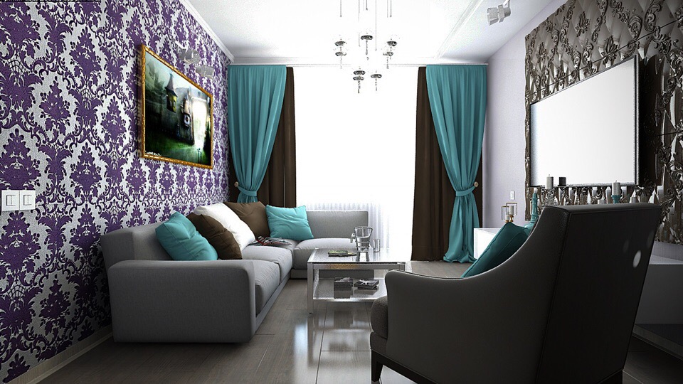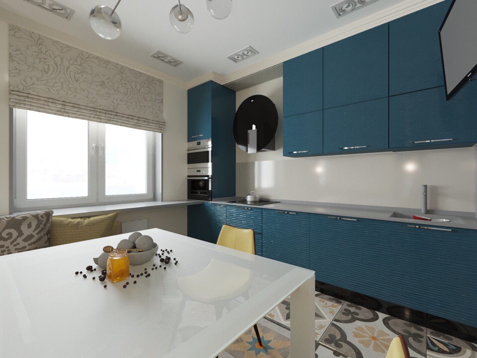 Ora la tendenza è sfumature profonde di blu, mirtillo, smeraldo e turchese. Questi sono colori freddi, quindi è importante mescolarli con competenza con altre tonalità di base. L'interno in questo caso sembra elegante e costoso.
