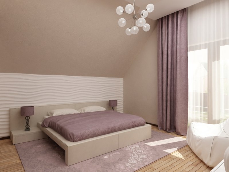 Con l'aiuto di una tale colorazione, puoi espandere visivamente lo spazio della stanza e contribuire a migliorare le condizioni degli abitanti della casa. Ma in una camera da letto in cui penetra la luce solare intensa, un tale colore non è quasi appropriato. È più ragionevole usare il beige in una camera da letto con scarsa illuminazione e una quantità minima di luce solare.