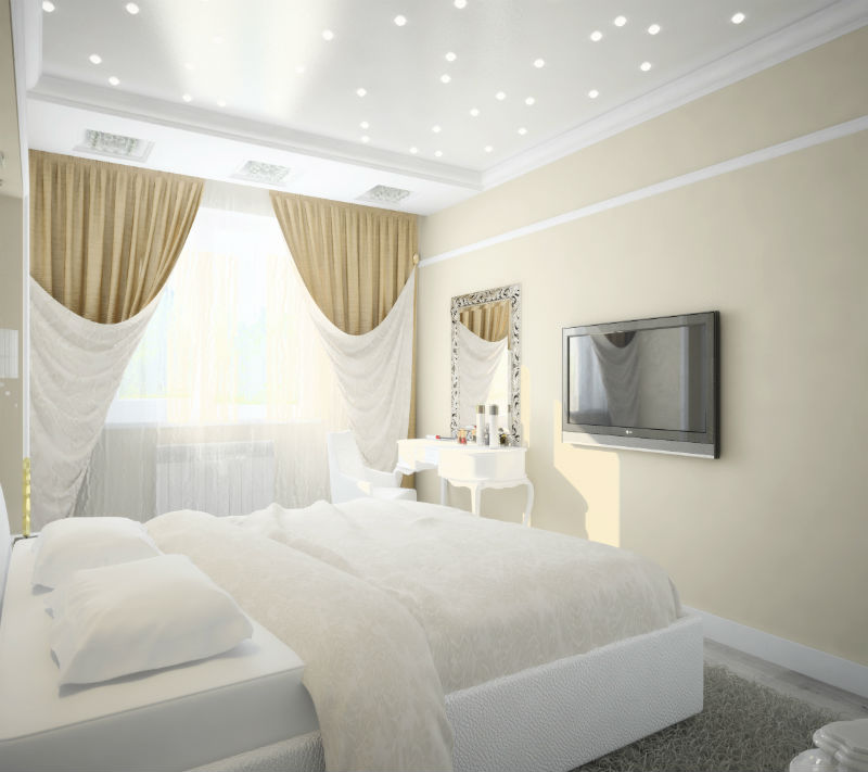 - Colore bianco nella decorazione può sembrare molto fresco e armonioso. Tuttavia, se progetti l'intera camera da letto solo in bianco, sembrerà sbiadita e opaca, ricordandoti l'ospedale. Sarà bello aggiungere alcuni accenti luminosi al colore bianco, ad esempio un tappeto luminoso vicino al letto o un applique multicolore.