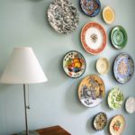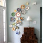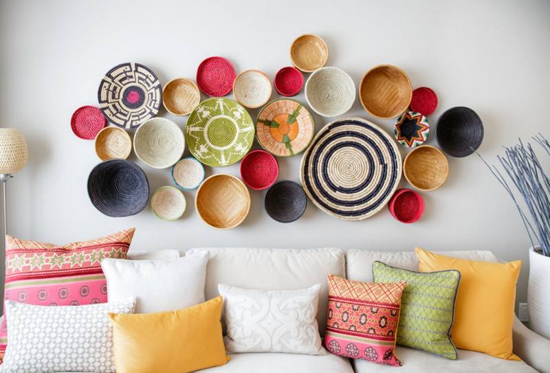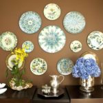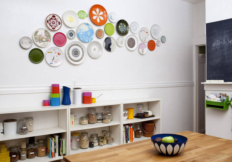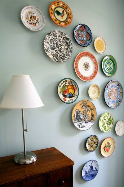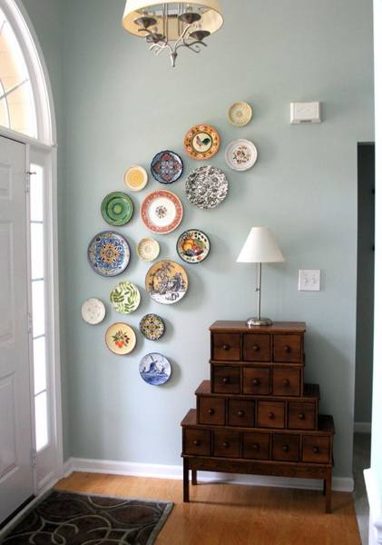 - sulla parete libera della cucina è possibile appendere piatti caratterizzati da una combinazione di colori e uno stile, ma le dimensioni possono essere diverse. Per lo stile country, sono adatti piatti di vimini dipinti con fiori per lo stile francese. In un interno moderno, puoi usare piatti di colori vivaci e forme semplici;