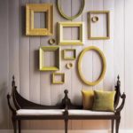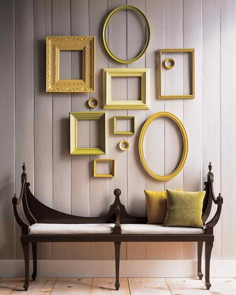 Una composizione di cornici vuote può essere una soluzione non standard per la progettazione di una parete libera semplice. Le cornici possono anche essere dipinte in un colore o creare un'opzione di colore;
