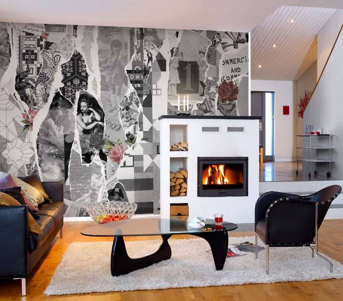 I murales con un'immagine realistica o astratta possono essere incollati su una parete sotto forma di accento (vedi Come scegliere lo sfondo nell'appartamento).