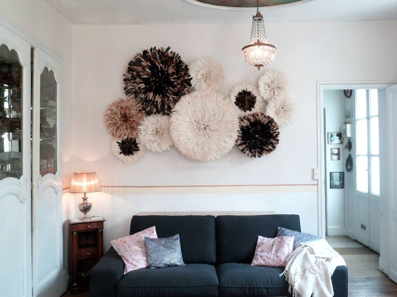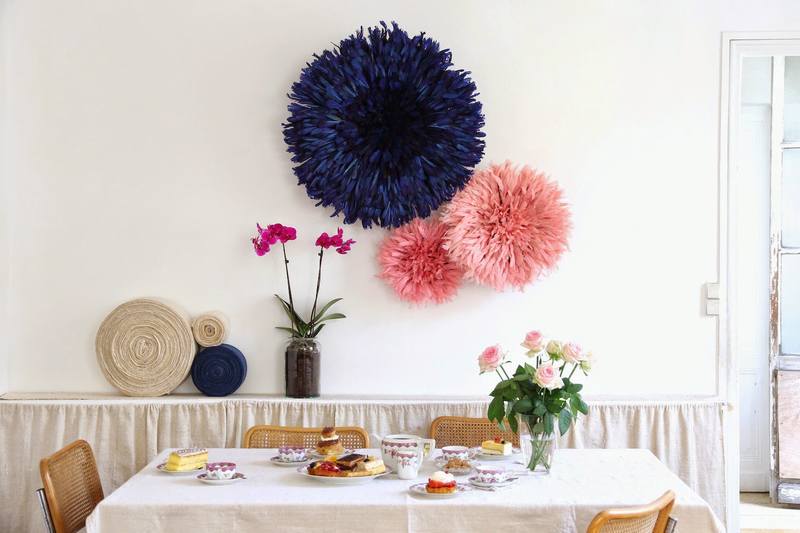 - Una composizione interessante può essere creata appendendo diversi cappelli camerunesi fatti a mano sul muro quando le piume sono attaccate alla base di rafia. Questo darà originalità anche agli interni più modesti. Anche i cappelli di paglia o di feltro più familiari trasformeranno una parete libera in un oggetto d'arte;