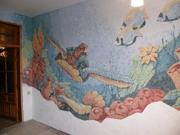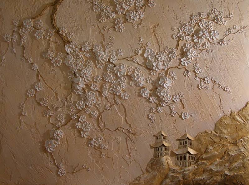 Utilizzando carta da parati liquida o intonaco decorativo sul muro, è possibile creare motivi utilizzando stencil, trasferendo l'immagine sul muro e riempiendo i suoi elementi con una miscela del colore desiderato (vedere Intonaco decorativo o carta da parati liquida: cosa scegliere).
