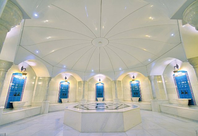 - La decorazione alla moda del soffitto è realizzata con stucco veneziano. Dopo l'essiccazione, le pareti acquisiscono una tonalità liscia e lucida con un motivo che ricorda il marmo liquido.