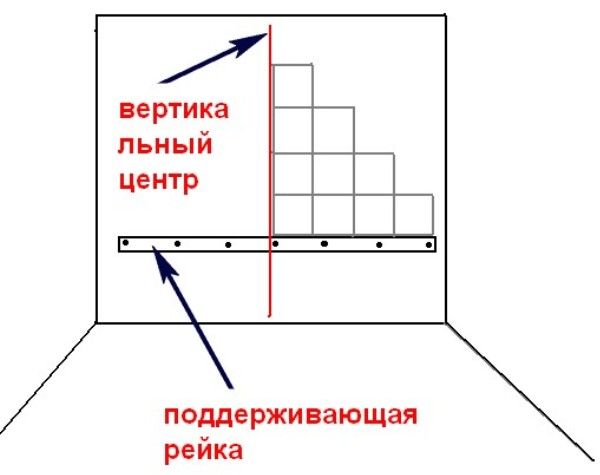 Negli angoli delle pareti è possibile creare strisce verticali con le quali saremo guidati in futuro. Dopo aver fatto tutto il lavoro di marcatura, iniziamo il processo di posa delle piastrelle.