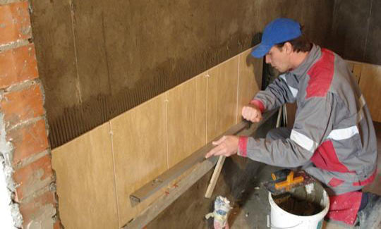 I lavori preparatori per l'installazione di piastrelle combinano l'intonacatura della superficie con l'aiuto di fari (vedi Istruzioni video: intonacatura di pareti su fari) e la posa del terreno.
