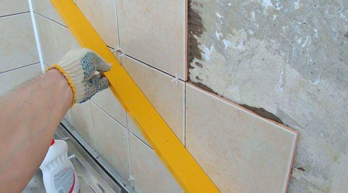 - Non appena posiamo le nostre piastrelle, le premiamo semplicemente con le mani, se le piastrelle sono grandi, allora prendiamo di nuovo un martello di gomma speciale. Non dimenticare la regola per determinare il livello di uniformità. Se necessario, una nuova tessera può essere colpita con un martello di gomma o semplicemente spostata in un altro posto, quindi quando la colla si asciuga, sarà molto più difficile effettuare tali manipolazioni. La soluzione adesiva mantiene tutte le caratteristiche e le proprietà per mezz'ora. Lo strato di adesivo in eccesso deve essere rimosso prima che sia asciutto. Se fai una pausa nella riparazione, devi rimuovere i resti di colla dalle pareti.