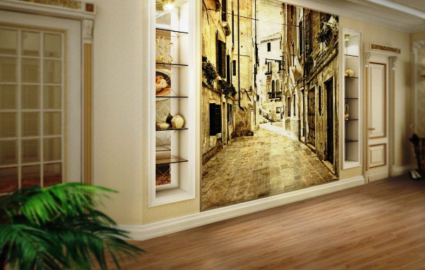 Separatamente, notiamo il potenziale della carta fotografica per la creazione di combinazioni (vedi Carta da parati nel corridoio: fai una scelta) Una combinazione di carta da parati nel corridoio con aree intonacate, mattoni o carta da parati liquida che sembra intonaco decorativo può rivelarsi molto efficace. Questa opzione è adatta anche per la progettazione dei corridoi della cucina o del corridoio sotto forma di un arco: le parti abrasive agli angoli sono facilmente riparabili e si possono evitare le difficoltà di incollare sezioni e unire fogli.