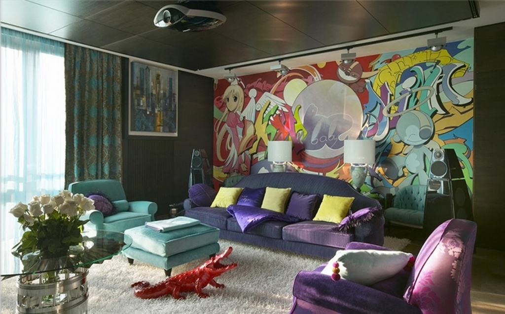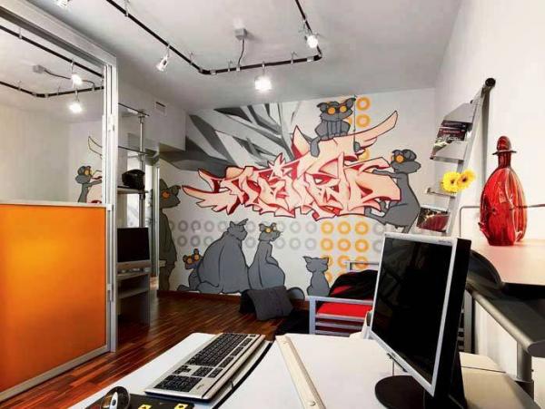 - Accento. Posizionando un'immagine colorata di graffiti in una stanza calma e persino noiosa, creerai un accento luminoso e dinamico all'interno, che aggiornerà la stanza oltre il riconoscimento.
