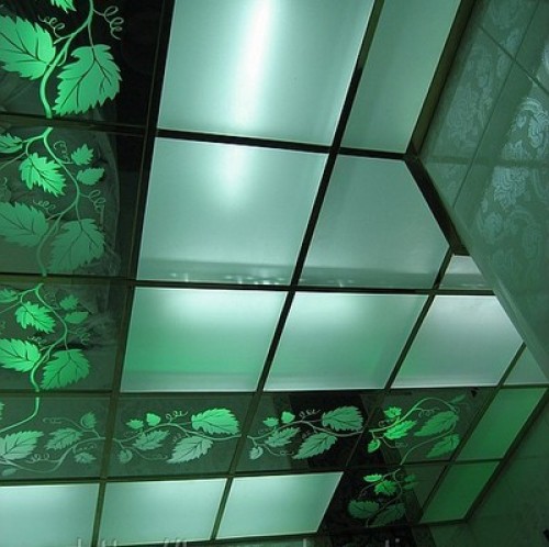 L'uso di pannelli per soffitti in vetro è stato recentemente utilizzato per lo spazio degli uffici. Questo tipo di materiale sulla superficie del soffitto sembra molto originale e insolito.
