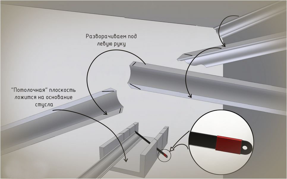 In luoghi aperti, posizioniamo, per quanto possibile, rotaie intere o parti tagliate lunghe, in modo che i giunti siano meno visibili. Quando si tagliano le doghe dello zoccolo del soffitto, progettato per decorare gli angoli all'interno e all'esterno, ci concentriamo sullo spessore dei bordi delle guide per capire dove si trova la parte superiore, dove si trova la parte inferiore.