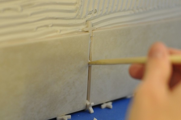 - Dopo l'asciugatura incompleta della soluzione adesiva, le croci di montaggio vengono rimosse dalle giunture tra la piastra in ceramica ed è necessario camminare lungo la giuntura con l'angolo di una spatola. È necessario rimuovere l'intera soluzione. Quando è completamente asciutto, questo non funzionerà;