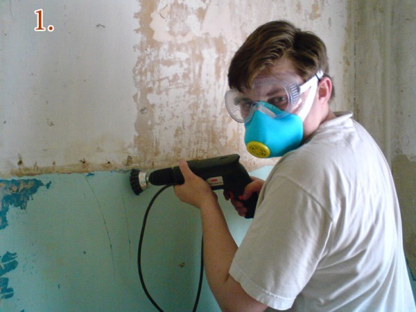 - Outils mécanisés. Il s'agit de la méthode la plus efficace et non toxique. Mais en même temps, une grande quantité de poussière se forme, qui pénètre même à travers de petites fissures et se propage sur de longues distances, ce qui nécessite l'organisation de l'isolation des salles blanches et des objets existants dans la pièce lors des réparations. Lorsque vous utilisez une meuleuse avec un cercle large ou une perceuse électrique avec une buse, comme sur la photo.