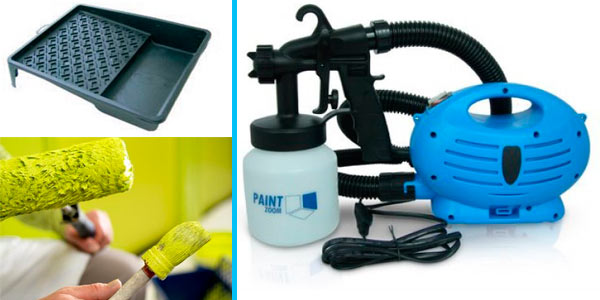 La photo montre un bac à peinture, un rouleau, une brosse et un pistolet pulvérisateur.