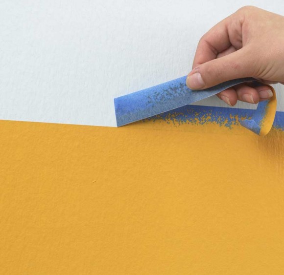 - Pour la fabrication de murs avec des lignes, des carrés et d'autres formes géométriques, vous pouvez utiliser du ruban de masquage. Cela rendra les bordures des lignes assez lisses, sans afflux. De cette façon, les surfaces murales monophoniques sont rendues diverses.