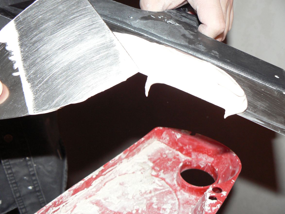 Ensuite, les coutures sont collées avec une serpentine et immédiatement remplies de mastic directement à travers les cellules de la maille en fibre de verre. La deuxième couche de mastic est appliquée après que la première a séché et cache complètement la faucille.