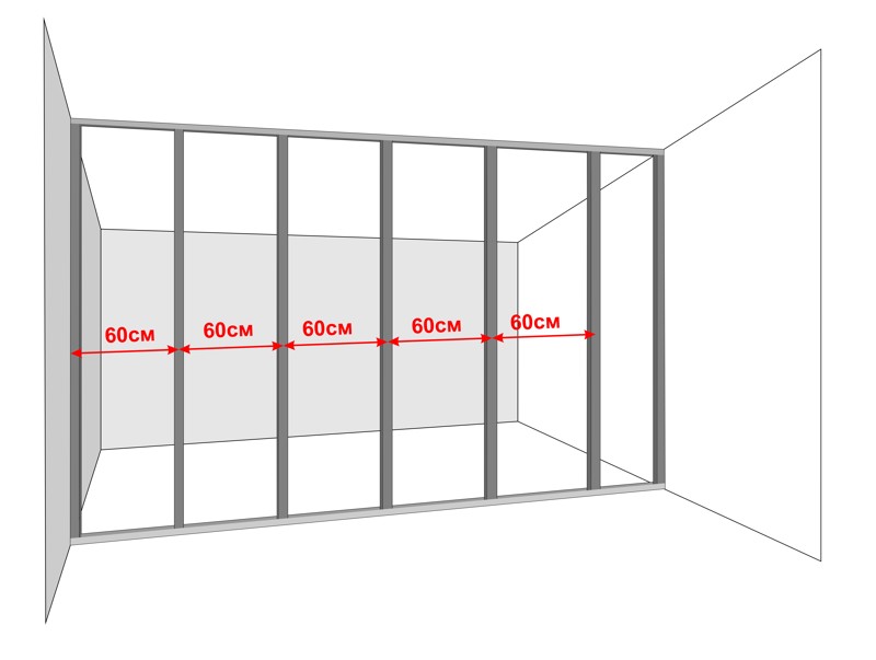 - Marquez la position des supports sur le sol et le plafond. Rappelons que le pas entre leurs axes dans le cas général est exactement de 600 millimètres: ainsi les bords des plaques de placoplâtre adjacentes seront exactement au milieu du rack;