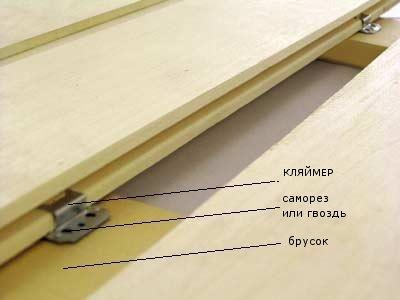 - Si face panneau de bois d'une part a une rainure, et d'autre part un peigne (comme une doublure), il est monté à l'aide de pinces spéciales, qui sont fixées avec de petits goujons ou des vis autotaraudeuses. Le panneau suivant est inséré à fond avec un peigne dans la rainure du précédent;