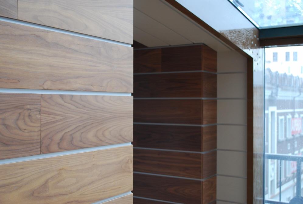 - Placage - c'est l'application de placage à partir de bois naturel d'essences précieuses sur la couche supérieure du panneau. De ce fait, le panneau acquiert une apparence esthétique et noble.