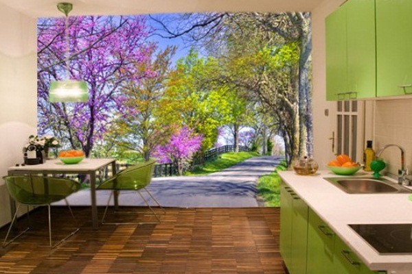 Attention: lors du choix du papier peint photo, vous devez suivre les mêmes règles que lors du choix du papier peint ordinaire pour la cuisine. Il est préférable que le papier peint soit en non-tissé ou en vinyle, et toujours avec la possibilité d'un nettoyage humide. Vous pouvez utiliser des peintures murales en papier, auquel cas elles doivent être vernies.