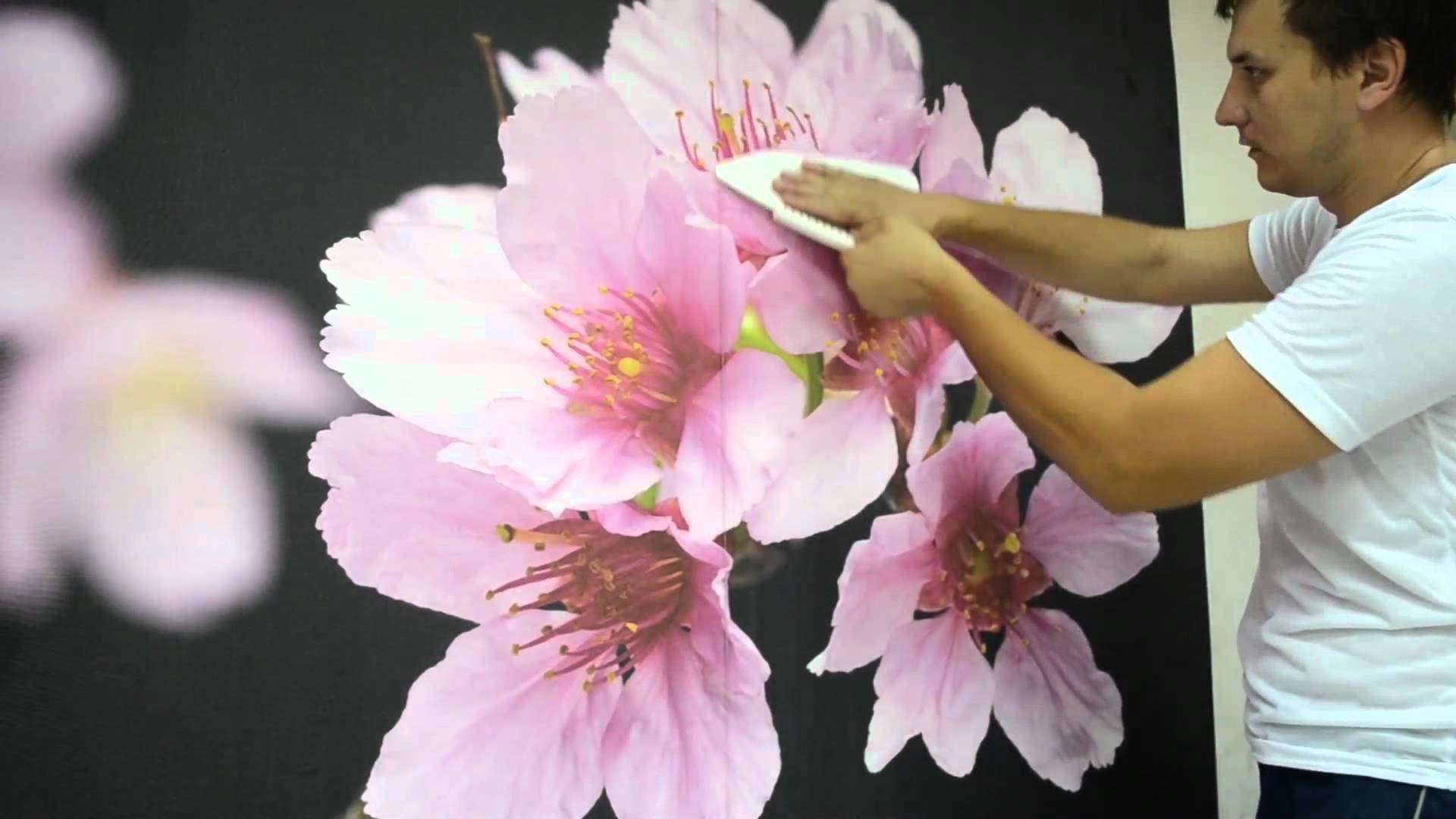 Maintenant, en retirant progressivement le papier protecteur, lissez le papier peint dans le sens du collage, en expulsant progressivement toutes les bulles d'air. Il est préférable de le faire ensemble, lorsqu'une personne tire lentement la couche de protection sur elle-même, et la seconde, lisse la toile en la collant au mur.