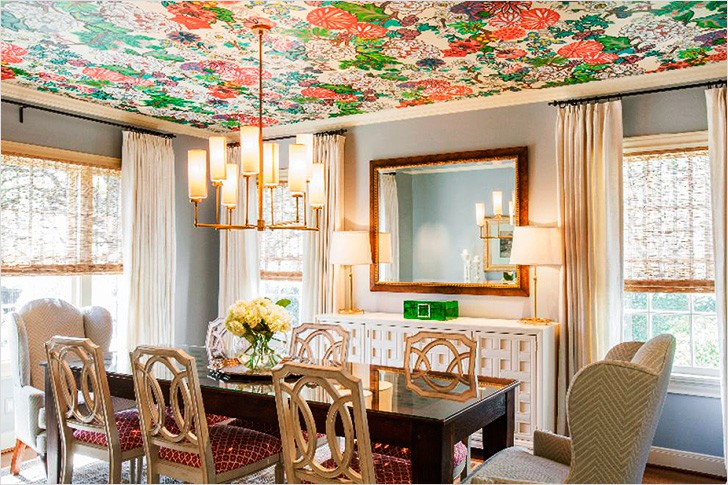 Le papier peint au plafond offre plus d'occasions de créer un design d'intérieur et des techniques de design intéressants. Par exemple, vous pouvez choisir un papier peint au plafond et sur les murs dans une seule palette de couleurs, ce qui les rendra un tout ou utilisera la même image sur des arrière-plans de couleurs différentes.