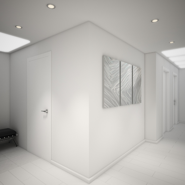 Utile: le même effet peut être obtenu en combinant des surfaces brillantes et mates, ainsi qu'en jouant avec l'éclairage des murs. Un mur brillant et fortement éclairé s'éloigne visuellement du spectateur, tandis qu'un mur terne et sombre s'assoit.