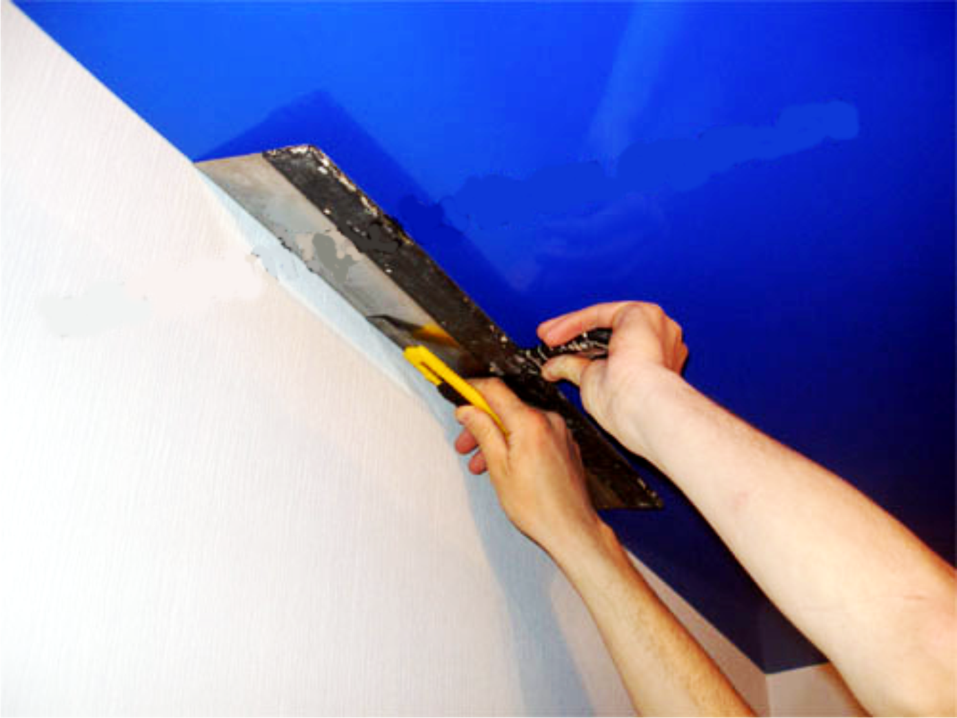 - La bande est coupée avec de petites saveurs sur la baguette et la plinthe. En collant, le papier peint est coupé avec un couteau de bureau sur une large spatule ou règle en acier;