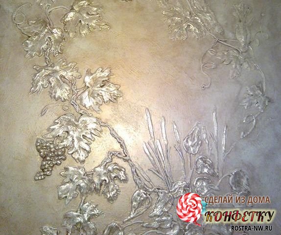 - Gesso. Possui uma longa preservação de sua aparência original e elegante. É um material ecológico, adequado para uso em ambientes com umidade e temperatura diferentes. Nele, você pode fazer desenhos fantásticos, que leem perfeitamente todas as nuances do relevo.