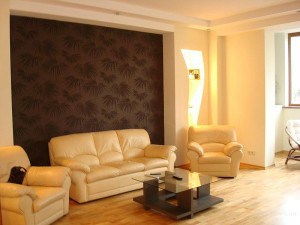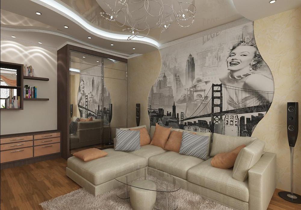 As bordas do quadro estão ocultas sob um disfarce; portanto, esse método se refere a um processo simples e não é trabalhoso para concluir, e o preço é adequado. - Se várias zonas forem montadas em uma sala, elas poderão ser separadas por inserções de papel de parede para grandes áreas. Cada zona pode ser colada com papel de parede, combinado em cores e tons, o que enche a sala de dinâmica e dá uma coloração emocional.